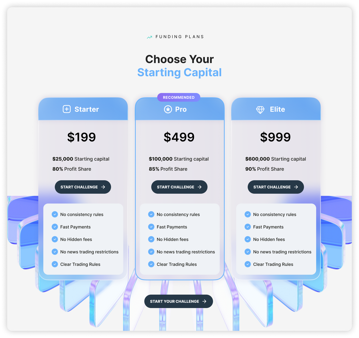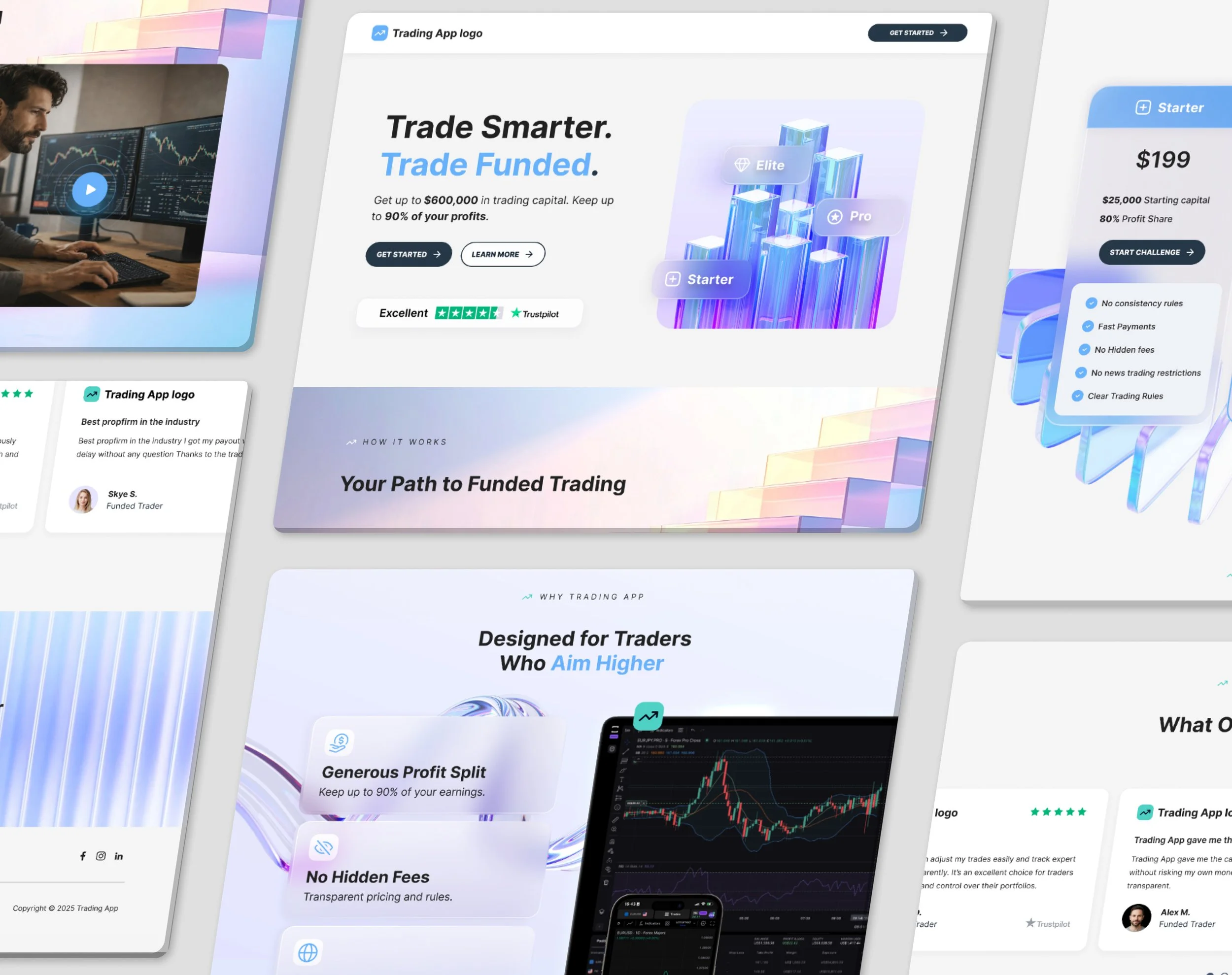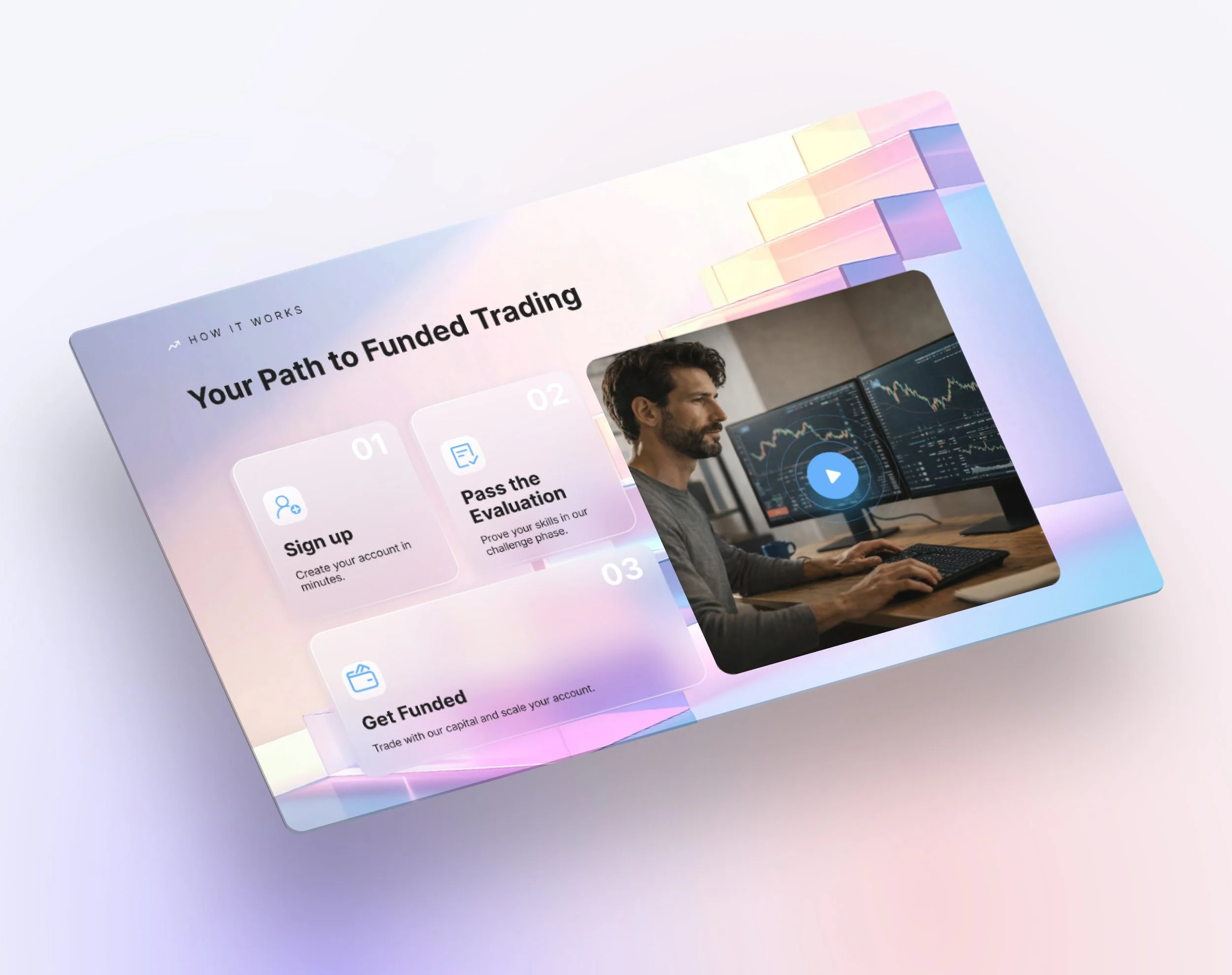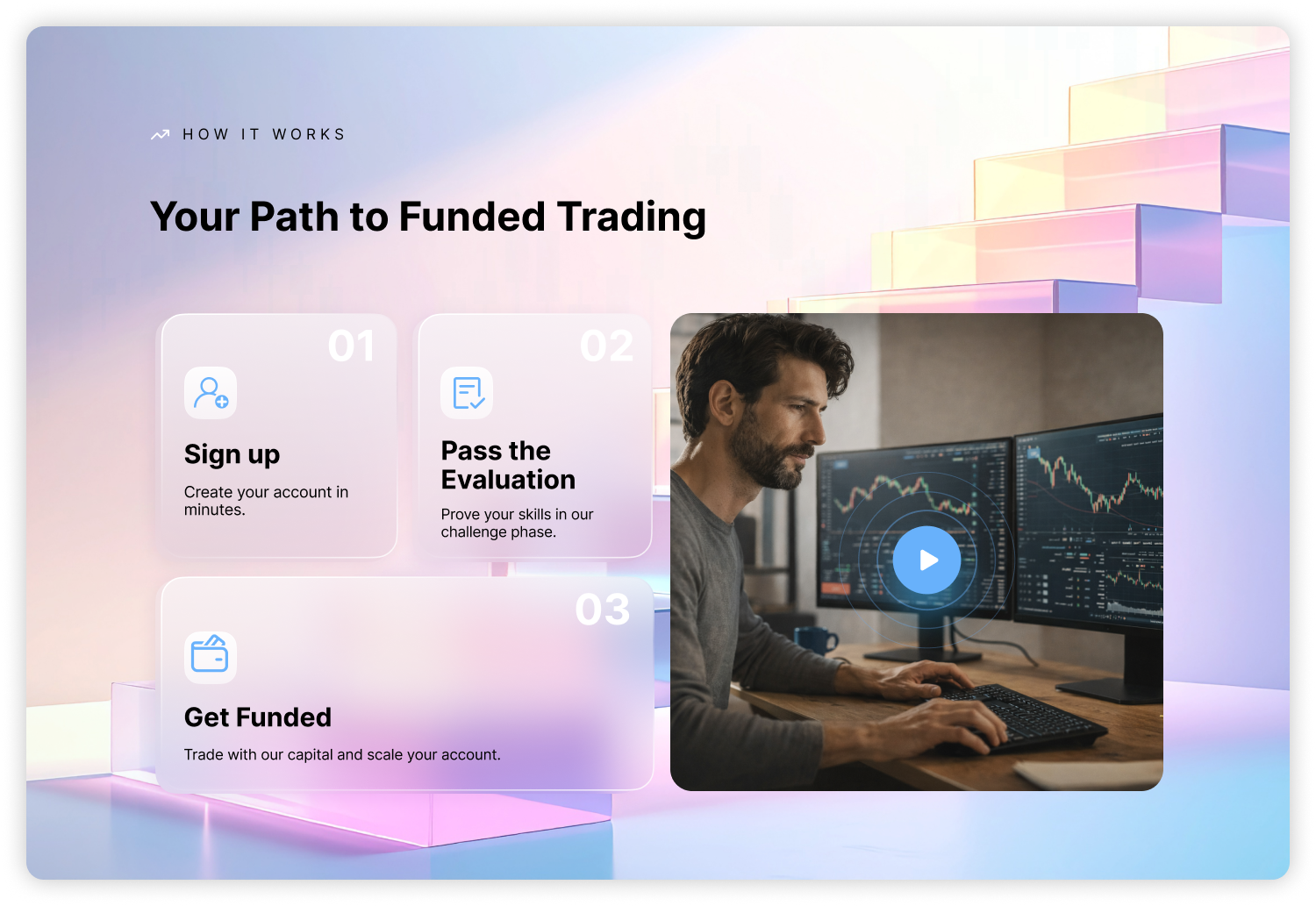 By using a “light landing page” approach with translucent modern colors and shapes, we create a more open, premium, and fresh feel. The translucency echoes the idea of transparency in trading and funding.