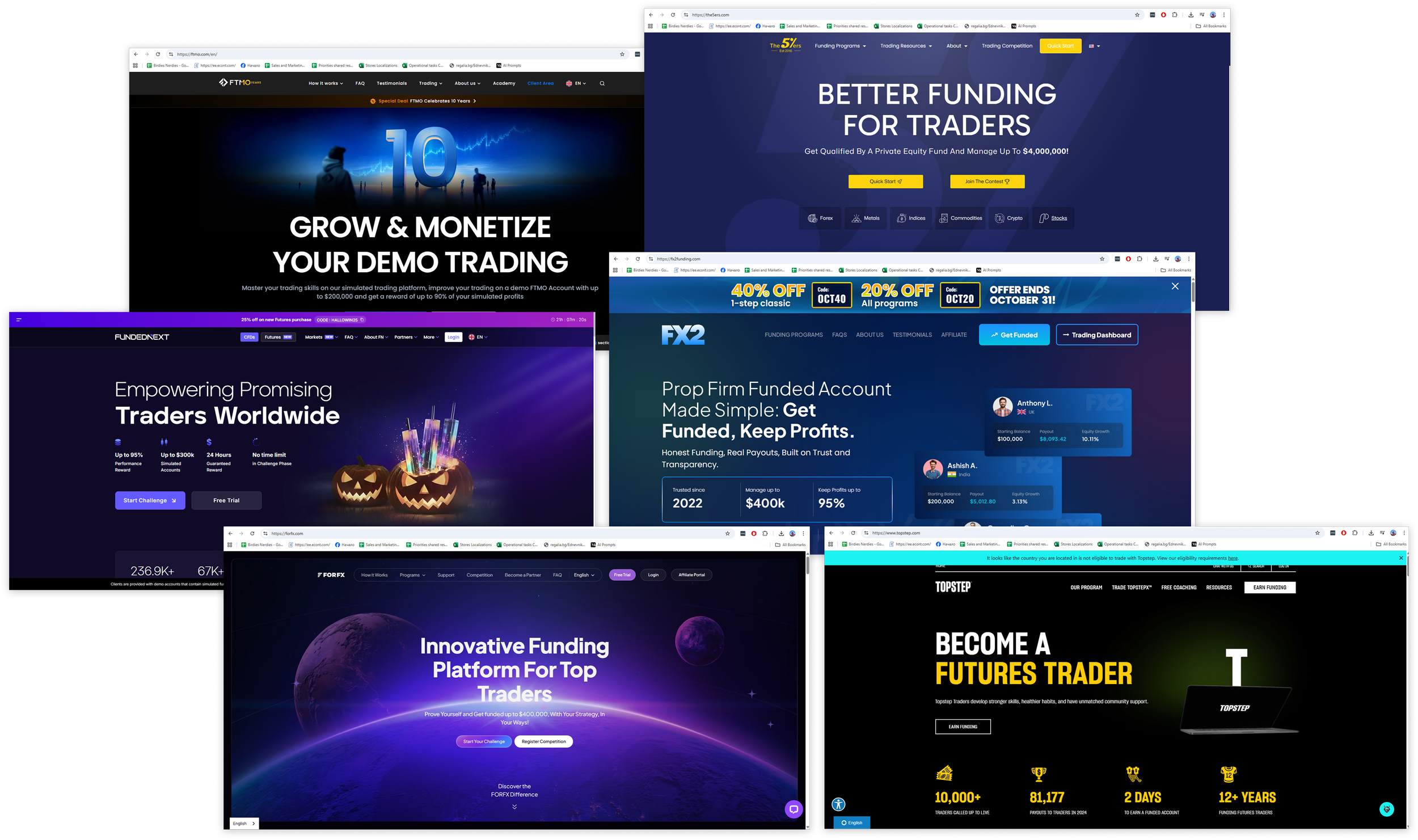 These sites tend to have glossy, high-impact hero visuals and big claims (profit splits, account sizes) rather than showing real trader presence.