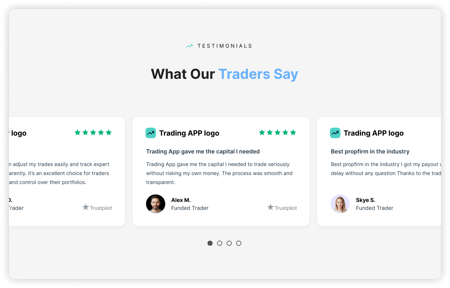In the Testimonials section, I have added more than 1 review, taken from TrustPilot and selected so that they contribute even more to the authenticity and trust in Trading App.